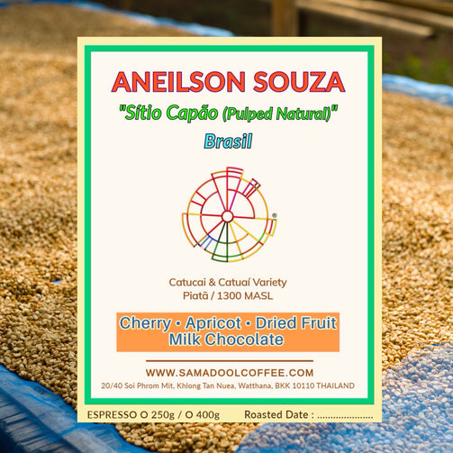 Aneiuson takes great pride and care in the way that he harvests and processes his coffee, from the preparation of the land through to the final storage of parchment. During harvest, all cherries were picked by hand only when fully ripe, with most of the labour being provided by him, his family and a handful of neighbours and seasonal workers. During the harvest, the team transport the freshly selected cherries in baskets to be depulped twice a day at Sítio Capão’s small wet mill. By doing all of the wet processing onsite, Aneiuson retains full autonomy over how each coffee lot is treated, ensuring the highest quality is achieved and reducing overall operating costs.