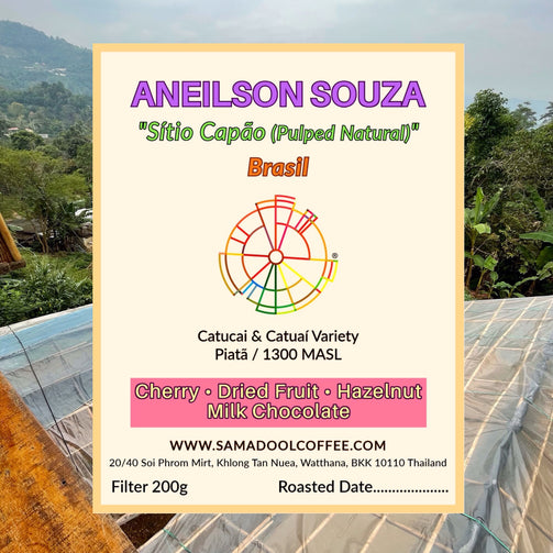 Aneiuson takes great pride and care in the way that he harvests and processes his coffee, from the preparation of the land through to the final storage of parchment. During harvest, all cherries were picked by hand only when fully ripe, with most of the labour being provided by him, his family and a handful of neighbours and seasonal workers. During the harvest, the team transport the freshly selected cherries in baskets to be depulped twice a day at Sítio Capão’s small wet mill. By doing all of the wet processing onsite, Aneiuson retains full autonomy over how each coffee lot is treated, ensuring the highest quality is achieved and reducing overall operating costs.