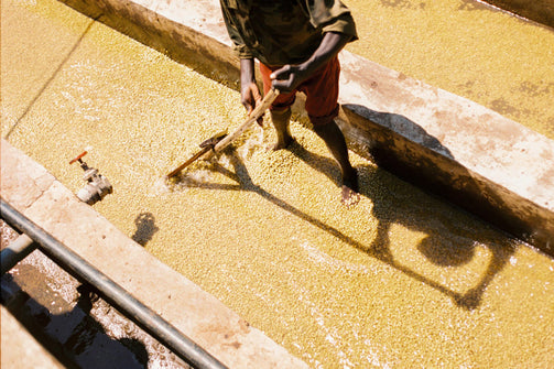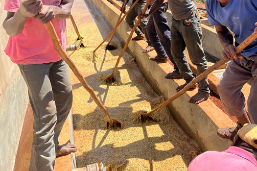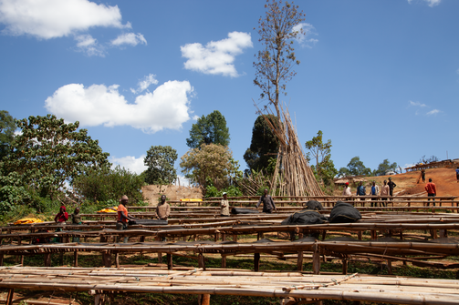 The coffee is then re-washed and graded again by density in washing channels and laid out to dry on raised beds under parabolic shade for up to fifteen days, depending on the weather. Whilst drying, the coffee is carefully hand-sorted and turned, to ensure defects are removed as the parchment dries evenly and consistently. Once the coffee is dry and has reached its desired humidity, it is rested in parchment until it is ready for milling and export.