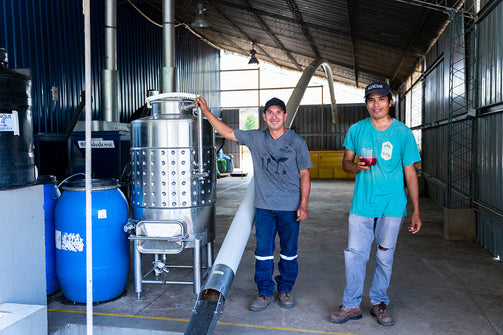 Cherries for this lot were delivered to Agricafe’s state of the art mill El Fuerte in the evening. After being inspected and weighed, the coffee cherry was carefully sorted by weight using water, and floaters were removed. Following this, the coffee was disinfected, in a similar process used for wine grapes, and then placed whole, with their skin to ferment under controlled temperature and pH conditions in the family’s brand new custom-built stainless steel tanks for 48 hours. Shutting the containers allows CO2 to build up, increasing the temperature and catalysing a process of intracellular fermentation. The team at El Fuerte made sure the lid remained shut for the full period of fermentation, to ensure no oxygen touched the cherries and that the punch-like, boozy aroma remained trapped inside.