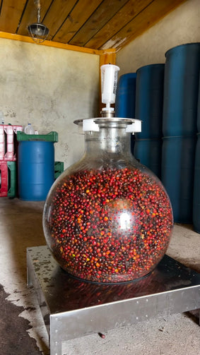 The coffee cherry was anaerobically fermented in a 115L Bordeaux glass wineglobe for 30 hours. Afterwards it was washed, then it was placed on raised beds for four days. After the initial drying the coffee was dried in the cushy confines of the darkroom. This method of dehydrating the coffee has become the gold standard in Panama.
