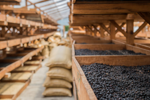 On the same day that they were picked, the fully ripe cherries were washed thoroughly in the receiving tanks, and additional water was passed over them to remove any traces of dirt. They were then left in this tank overnight. The next day the cherries were taken through the washing channels to ensure there were no floaters, and then transferred directly to the African beds inside the greenhouse where they were turned every thirty minutes initially, and then as the beans dried out this was increased to every fifteen minutes to ensure uniform drying. Drying took around twenty-one days to reach the desired moisture level.