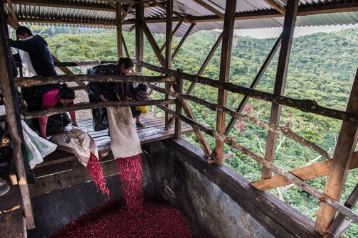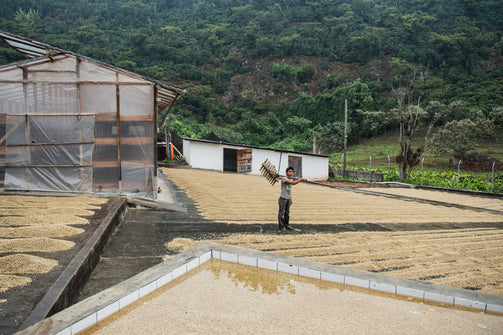 Within hours of being picked, the red cherries are transported by foot or tractor to Santa Isabel’s wet mill (located on the farm) where they are sorted through a mechanical siphon and graded by weight. They are pulped immediately and then fermented for up to 17 hours, and then passed through a “washer” to remove any remaining fruit. The coffee is then passed through channels and graded by weight, and then soaked in clean water for 24 hours. It is then dried in the sun for 10–15 days until it reaches 30% humidity and is then transferred to a greenhouse to finish drying on raised beds. Their aim is to dry coffee slowly and consistently, with an ideal 5% drop in humidity per day, until humidity is 11%.