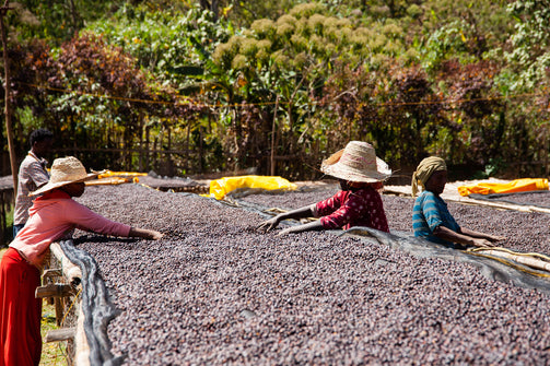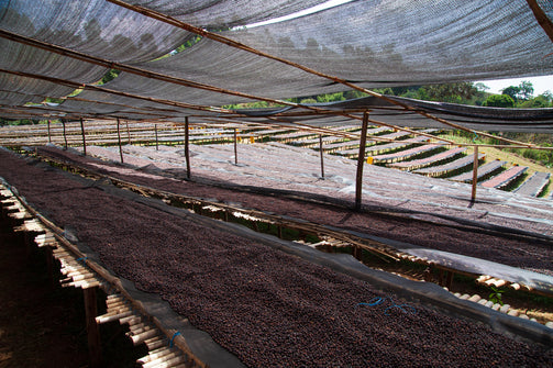 The coffee is then graded by weight and spread evenly on raised beds to dry in the sun. Initially, it is laid very thinly and turned regularly to ensure consistent drying and prevent over-fermentation. This is done very carefully to avoid damage to the fruit.