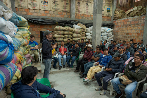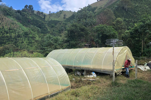 The coffee was then carefully dried (over 10–18 days) on parabolic beds, which are constructed a bit like a ‘hoop house’ greenhouse, and act to protect the coffee from the rain and prevent condensation dripping back onto the drying beans. The greenhouses are constructed out of plastic sheets and have adjustable walls to help with airflow, and temperature control to ensure the coffee can dry slowly and evenly. Once dry, the coffee was delivered to Pergamino’s warehouse in Medellín, where it was cupped and graded. Once approved, coffee rested in parchment until it was ready for export.